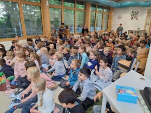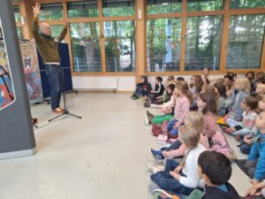 Er hat uns viele Lieder und Gedichte vorgetragen, so zum Beispiel vom „Fisch Fasch mit dem weißen Asch“, „Herr von Ribbeck auf Ribbeck“ oder von der Spinne Martha. Wir durften dabei mitsingen und mitsprechen.