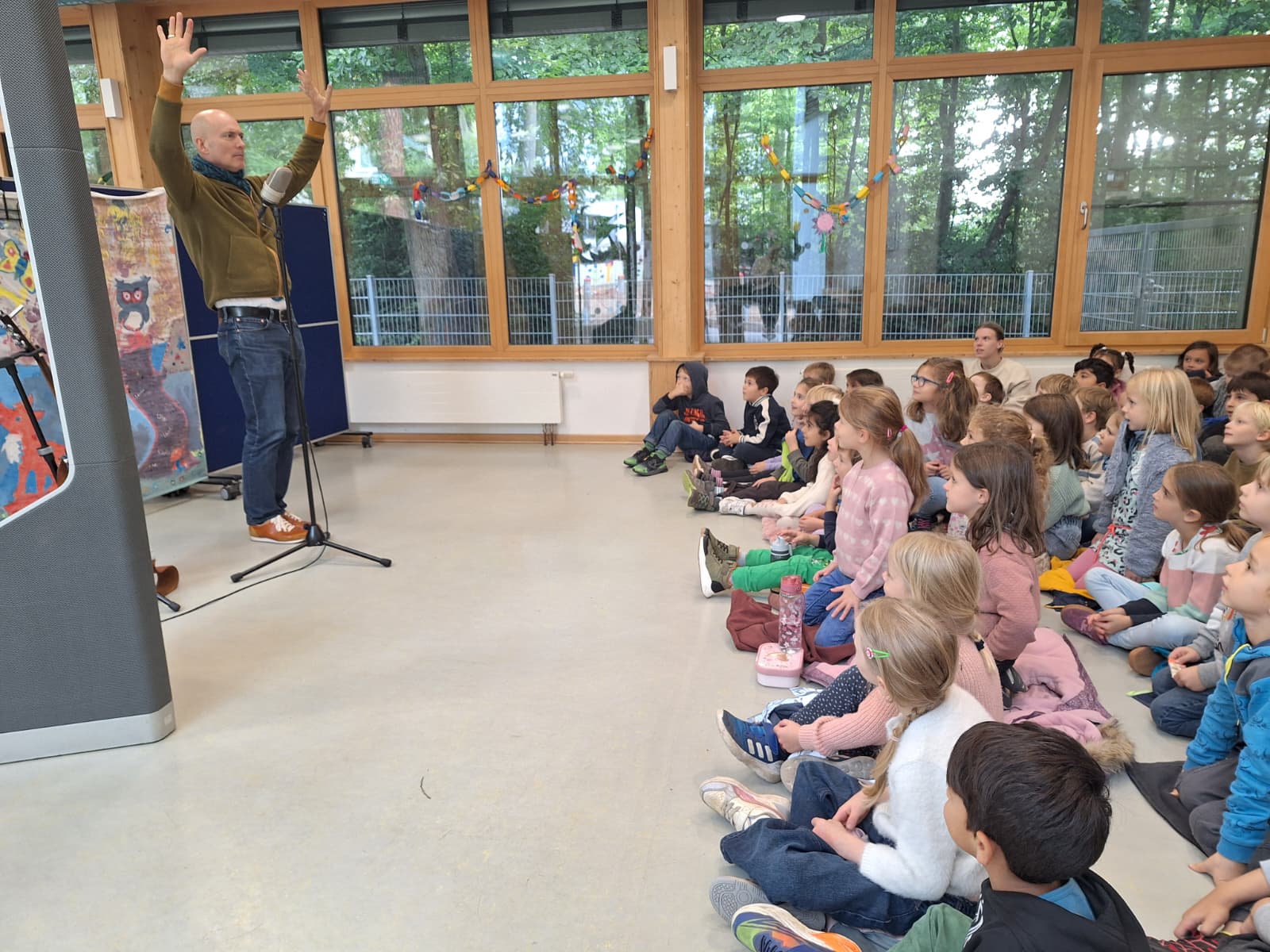 Er hat uns viele Lieder und Gedichte vorgetragen, so zum Beispiel vom „Fisch Fasch mit dem weißen Asch“, „Herr von Ribbeck auf Ribbeck“ oder von der Spinne Martha. Wir durften dabei mitsingen und mitsprechen.